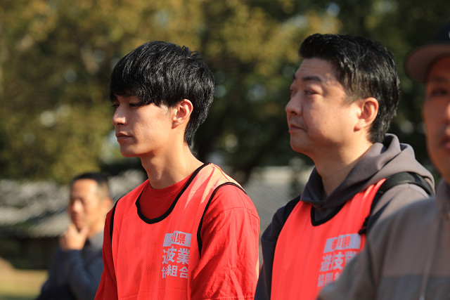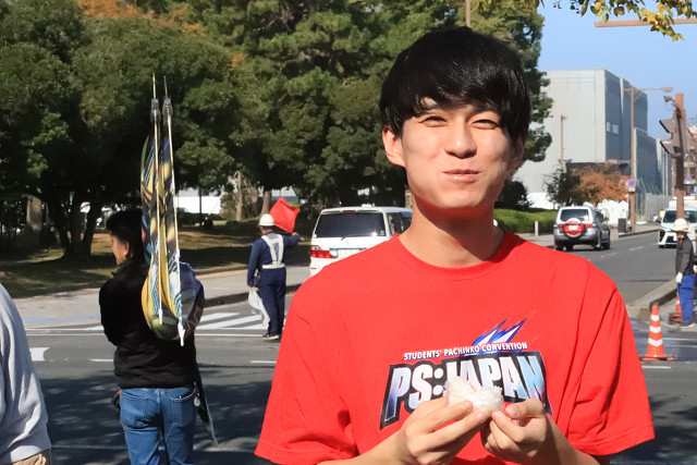 平山理事長が用意してくれた、おにぎりの差し入れを頬張る山東くん