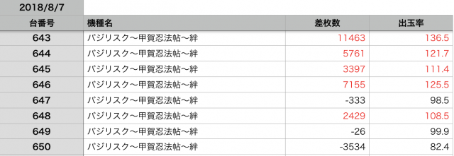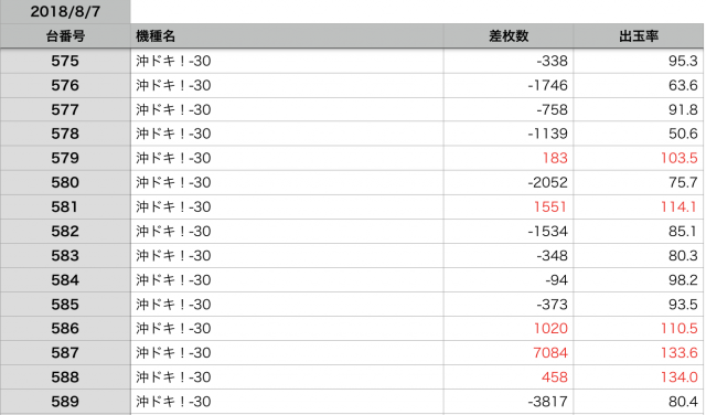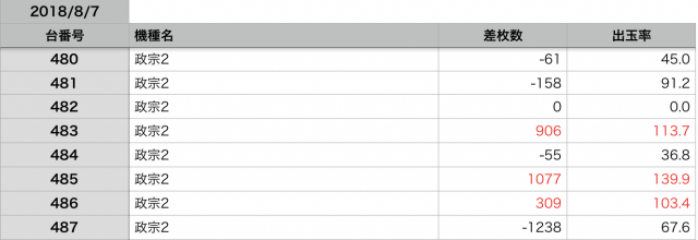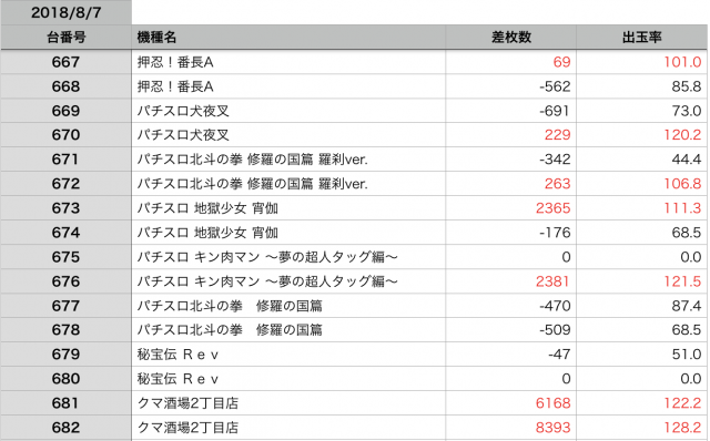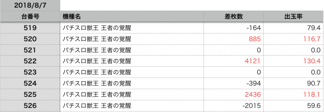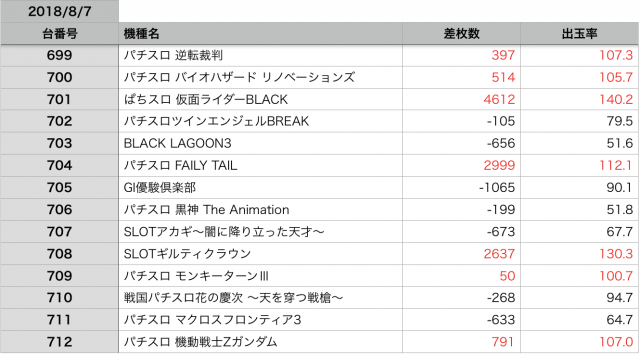 8月7日の全台データ(赤字がユーザー側のプラス、黒字がマイナス)↓