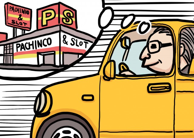 何台か向こうで打ってるかわいい女の子が気になる人のイラストです