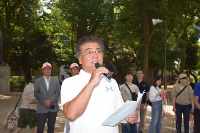 開会式で、日遊協社会貢献・環境対策委員会の知念安光理事は、「九州から参加されているファンの方もいると聞いて、驚いています。本日は、スポーツ感覚で楽しみながら、社会貢献してもらえれば」とあいさつ。