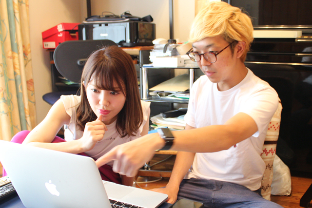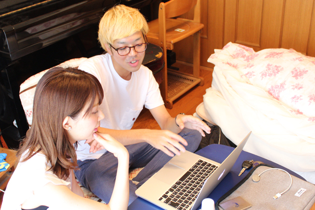 直敷き布団部屋でノートパソコンを見つけ、前のめりでボートレース予想の教えを乞う美穂。