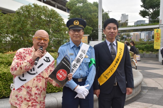 「野田阪神駅前広場」で行われたキャンペーンには、同組合・福島遊技業組合の玉城浩蔵組合長、河本博福島警察署長、キャンペーン隊長を務めたタレントのタージン氏が参加。