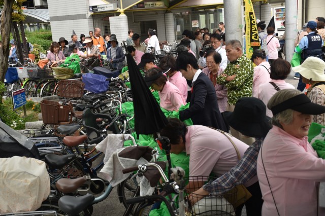 組合員約10人がボランティアスタッフとともに、ひったくり防止カバーを配布し、自転車への取り付け作業を行った。