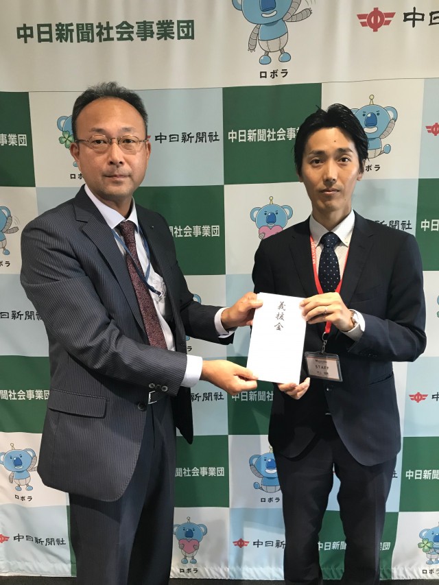 経営企画部の村上知隆課長が中日新聞社会事業団を訪れ、鈴村英司事務局長に手渡した。