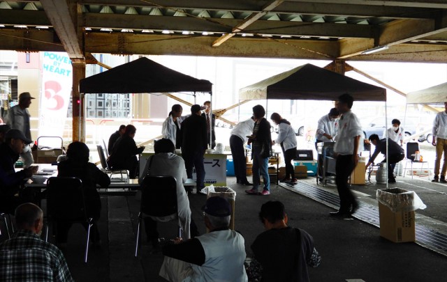 「魚津店」駐車場にて、カレーライスや豚丼、焼きそばを計300人前用意して、地域住民らに振る舞った。