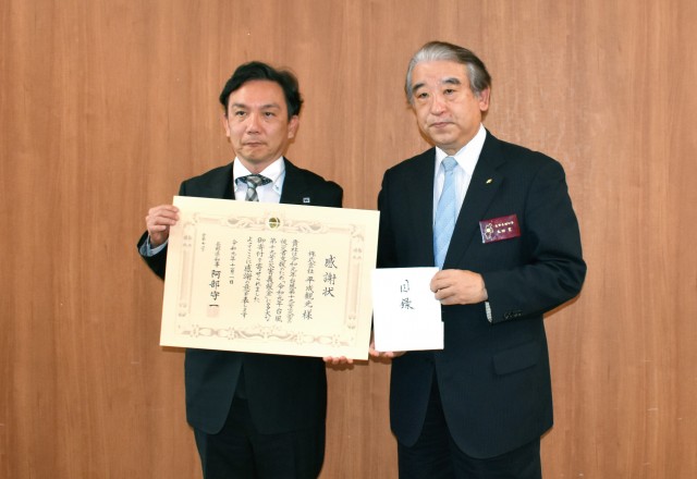 太田寛副知事に義援金を手渡すとともに、感謝状を受け取った。
