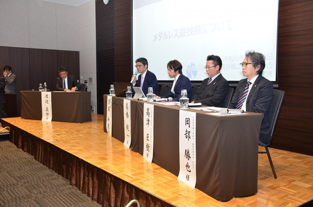 総会後の公開勉強会では、日工組の渡辺圭市技術担当理事、高津巨樹管理遊技機部会長、岡部勝也機歴管理部会長、日電協の岩堀和男副理事長、高橋純一技術ワーキンググループ長が登壇。