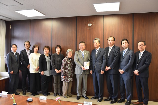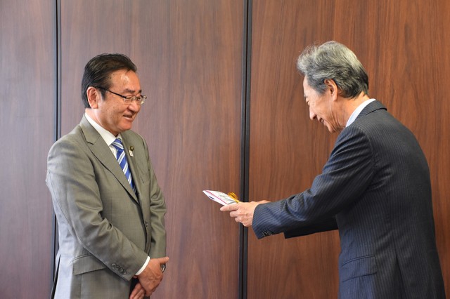 八王子組合の宮本勲組合長が、石森孝志市長に目録を贈呈した。寄付は今年で9年目。