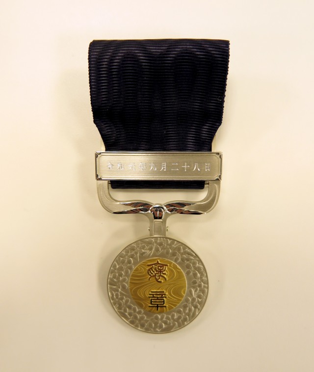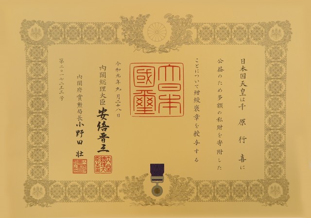 これは、「平成30年7月豪雨」に対し、日本赤十字社の活動支援金として私財を寄付した功績が認められ、9月28日に受章したもの。