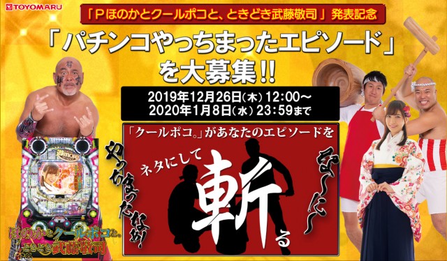 豊丸産業は12月25日、『Pほのかとクールポコと、ときどき武藤敬司』のリリースを記念して、クールポコ。の持ちネタ「な~に~、やっちまったな! 男は黙って○○!」にちなみ、「パチンコやっちまったエピソード」を募集すると発表。