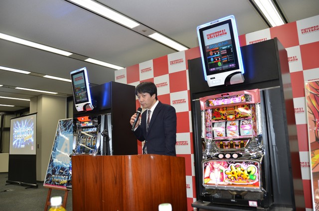 同部の小野豊主任は、「ミニ液晶、およびユニメモ(スマホ連動サービス)を搭載。小役カウント機能があるので、ぜひ役立ててください」とアピールした。