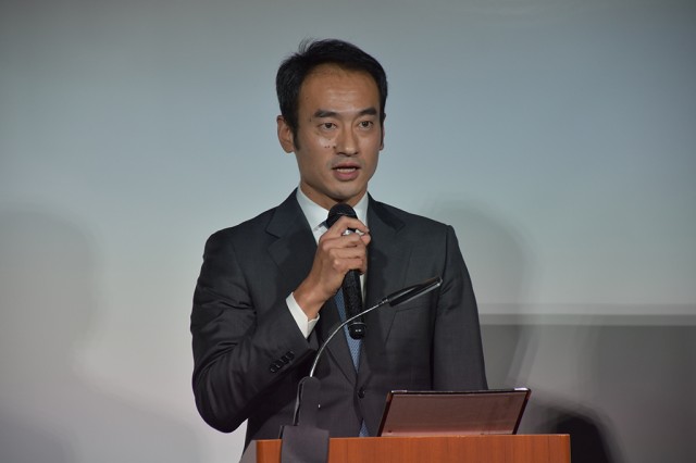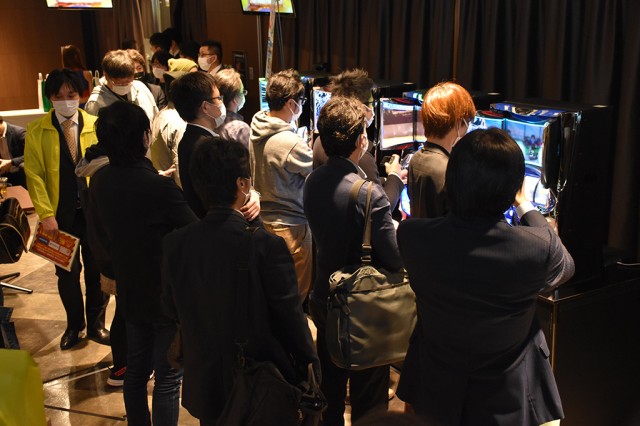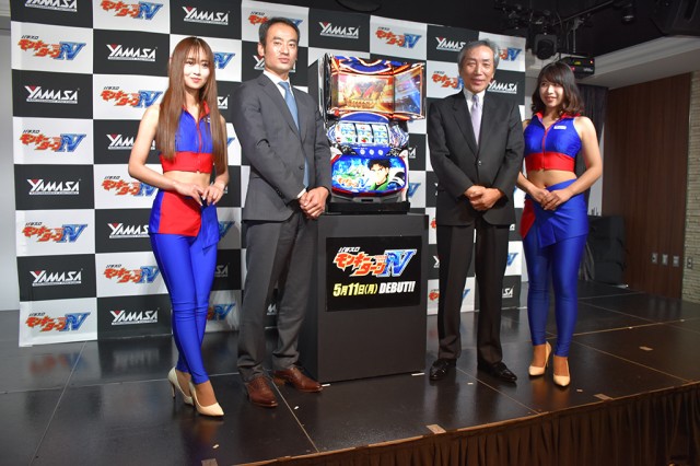 あいさつに立った佐野詳一取締役は「(通常時の)ゲーム数管理と、(AT中の)ゲーム数上乗せ、シナリオ管理といった『初代』のスタイルを受け継ぎ、6号機としての進化に徹底的にこだわりました」とアピールした。