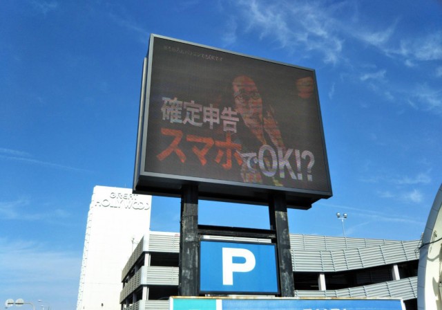 ホールでは、ポスターやデジタルサイネージ、LEDビジョンなどに、「確定申告スマホでOK!?」といったPRを展開。