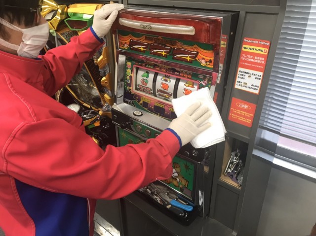 同サービスは、オープン前、または閉店後に、ノロウイルスやインフルエンザウイルス・結核菌などを、除菌・消臭する次亜塩素酸水をウエス(機械類のよごれをふき取るための布)に吹きかけて、遊技台とその周辺を丁寧に拭くもの。