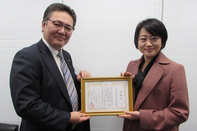 回胴遊商(大饗裕記理事長)は3月17日、東京都台東区の組合本部で養子縁組や子育て事業を行うアクロスジャパン(小川多鶴代表)からの感謝状を受領。