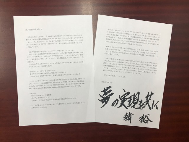 また、入社に際し、137人の新入社員あてに同社の韓裕社長より、「マルハンは100年企業に向かい、グローバル化・多角化を進め、社会に貢献できる企業を育てていきたい。皆さんの人生が輝かしいものになることを、祈念したい」というメッセージが送られた。