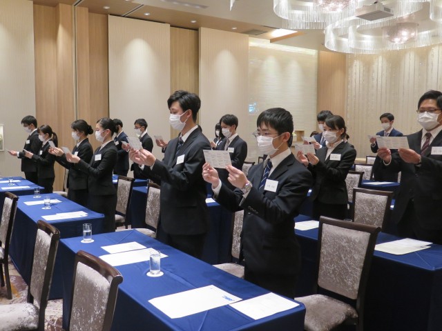 なお、今年度の入社式は、新型コロナウイルス感染症の対策として、健康状態の確認、時間短縮、列席者のマスク着用、座席の間隔をあけるなどの配慮を行った上で執り行われた。