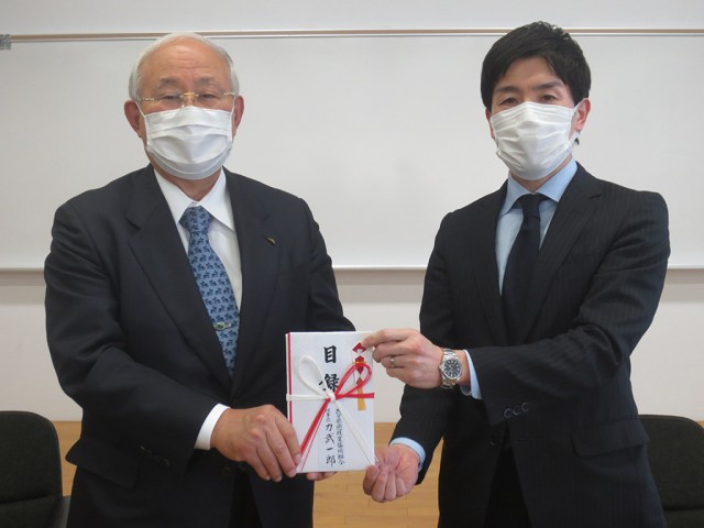 同医師会の近藤稔会長に、目録を手渡しした力武理事長は、「医療従事者の一助になれば」と語った。なお、30日ごろに届けられる予定となっている。