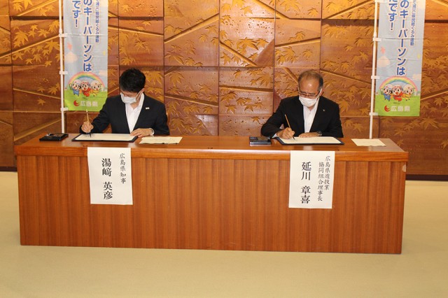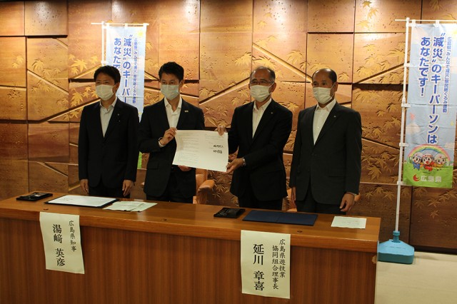 広島県遊協(延川章喜理事長)は6月12日、広島市の県庁で、延川理事長と湯﨑英彦知事出席のもと、「災害時における支援協力に関する協定」の締結式を開催。