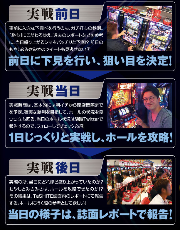 「前日の下見」「長時間実戦」「結果に基づいたREALレポート」と徹底的に優良ホールを調査し、プレイヤーのために攻略のヒントを導き出すぞ!