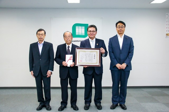 贈呈式では、大饗理事長に感謝状を贈ったHEM-Netの國松孝次会長は「回胴遊商さまから、定期的に寄付をいただいており、感謝に堪えません。