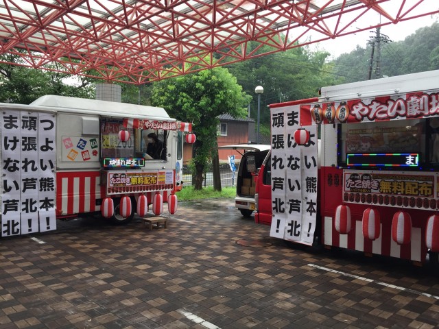 避難場所である「きずなの里」と「しろやまスカイドーム」で、被災者にたこ焼き(150パックずつ)を振る舞った。