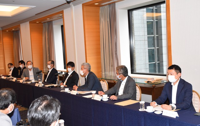 理事会後の記者会見には新任の平岡聖教副理事長と星野謙副理事長を含め、平川容志副理事長、松尾道彦副理事長、千原行喜副理事長、合田康広副理事長、太田裕之専務理事ら新執行部が全員出席。