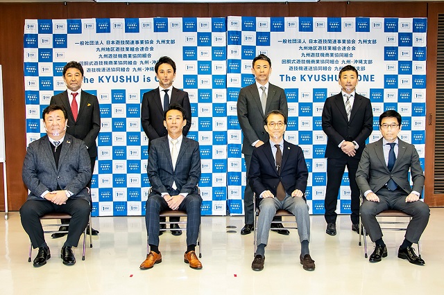 九州遊連(岩下博明会長)、日遊協九州支部(新冨雅哉支部長)、九州遊商(山本龍彦理事長)、回胴遊商九州・沖縄支部(田志直和支部長)、遊運協九州・沖縄支部(森田修一支部長)、および、日工組の指定処理業者であるユーコーリプロは11月16日、福岡市の「福岡遊技会館」で旧規則機の適正処理推進に関する説明記者会見を開催。