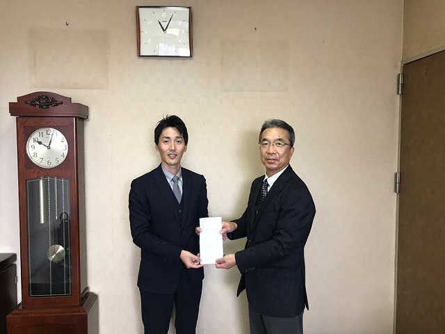 これは、同市に「プレイランドキャッスル大垣店」がオープンした2016年より毎年行っているもので、当日は、経営企画部の村上知隆課長が同所を訪問し、中山惠二常務理事に募金を手渡した。
