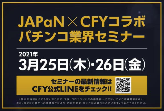 パチンコホールに特化した広告代理店CFYとホールやメーカーなどを対象に勉強会を主催する日本アミューズメントパチンコ産業ネットワーク(略称・JAPaN)は3月1日、同25・26日に開かれるウェブセミナー「JAPaN×CFYダブルインパクトセミナー」の参加受け付けを開始。