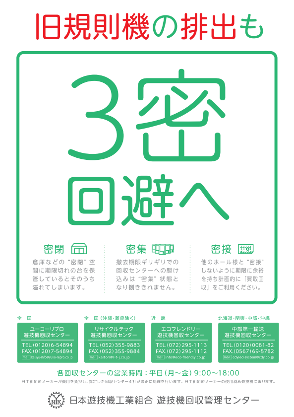倉庫などにある旧規則機の排出を促進するのが目的で、同組合が指定したリサイクル会社4社の連絡先が記載されている。