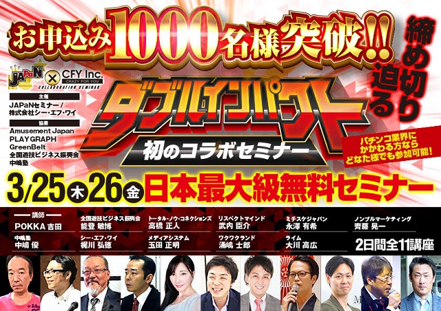 パチンコホールに特化した広告代理店CFYとホールやメーカーなどを対象に勉強会を主催する日本アミューズメントパチンコ産業ネットワーク(略称・JAPaN)は3月15日、3月25・26日に開かれるウェブセミナー「JAPaN×CFYダブルインパクトセミナー」の参加申し込みが1000人を突破。