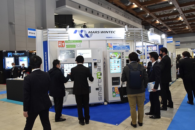 マースウインテックは、ICカード対応ロッカー用電子錠やセルフ除菌カードクリーナー、高速紙幣整理機(マースコーア製)などを展示。注目を集めた。