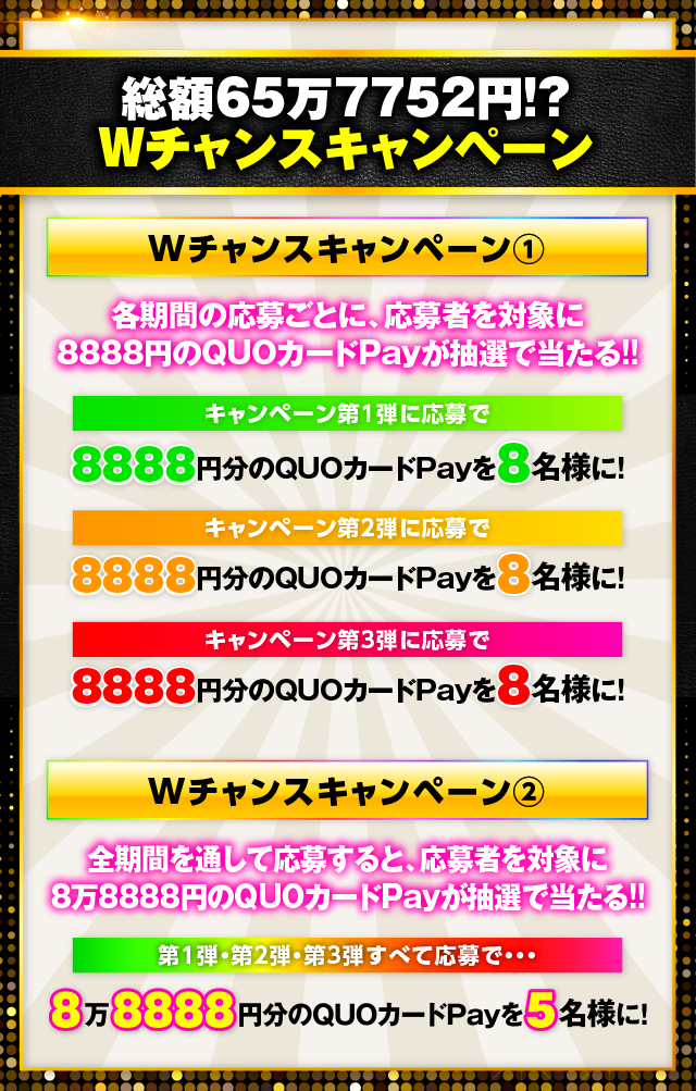 さらに全期間を通して、第1弾〜第3弾すべてに応募をすると、もっとWチャンスで桁がアップ! 抽選で8万8888円分が当たります!