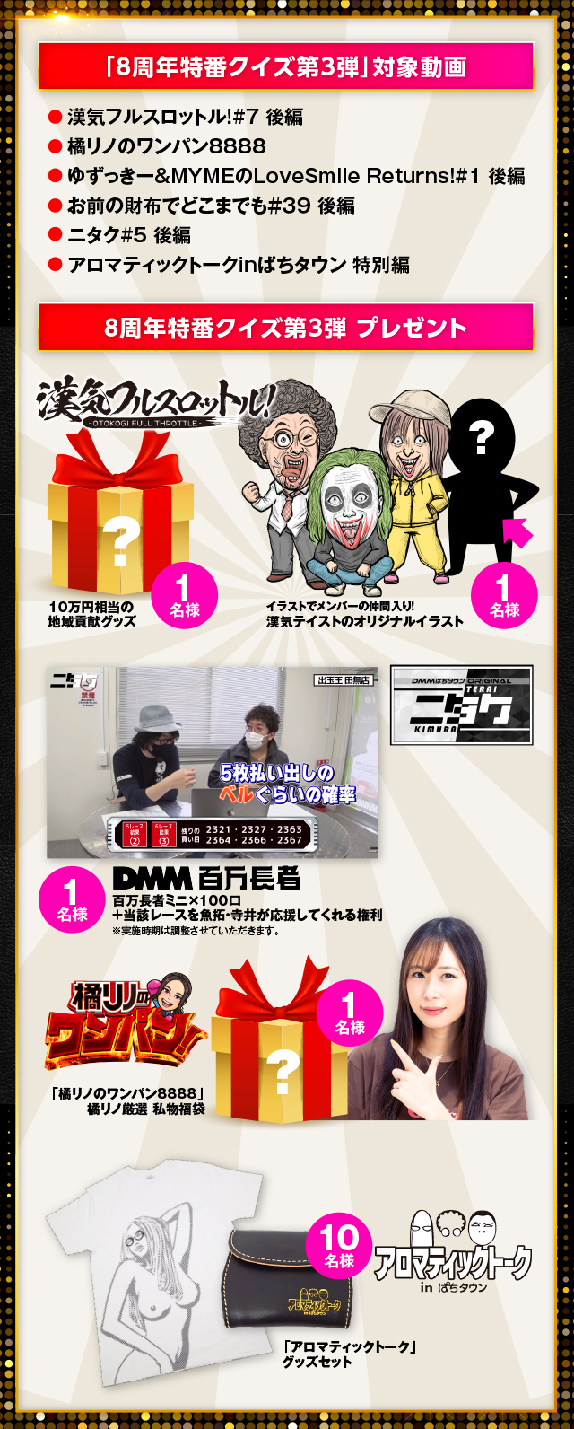 「アロマティックトーク」では、アロマな3人とDMMぱちタウン専属タレントがスペシャルトーク! 8周年だからこそ実現した夢の企画をぜひご覧ください!