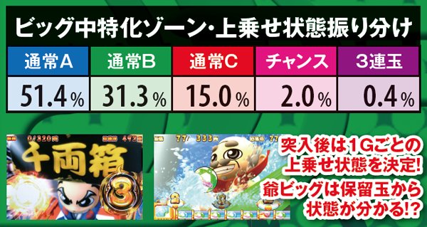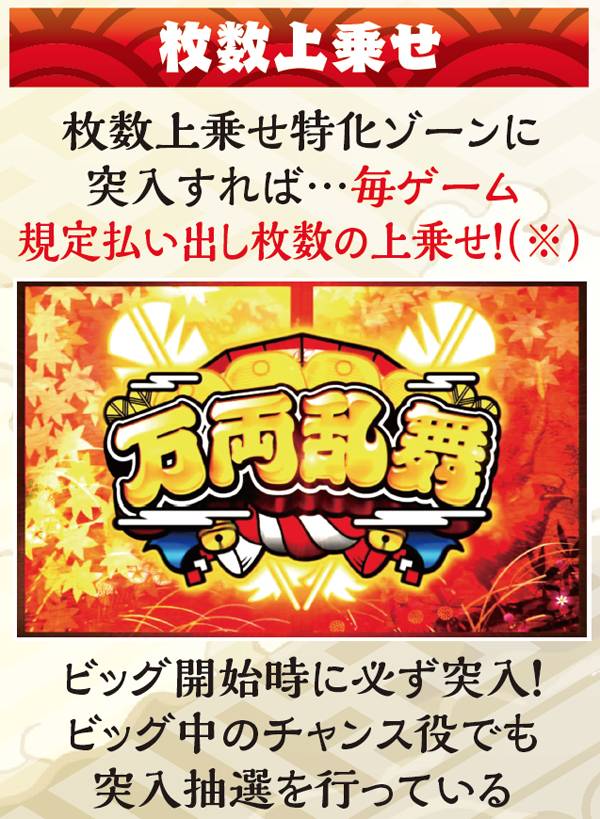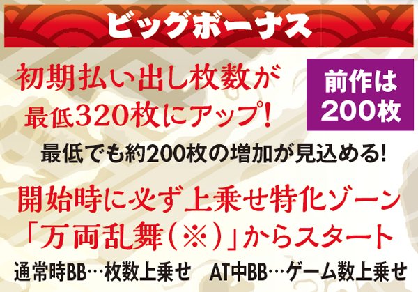 ビッグは枚数管理型の擬似ボーナスで、突入時は必ず上乗せ特化ゾーンからスタート。消化中はチャンス役成立で上乗せ特化ゾーン突入抽選が行われ、7揃いはビッグ1G連、家紋揃いは消化後のAT突入が約束される。