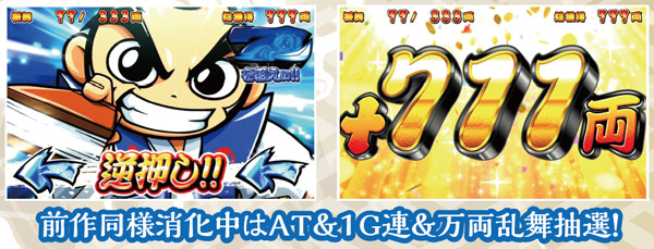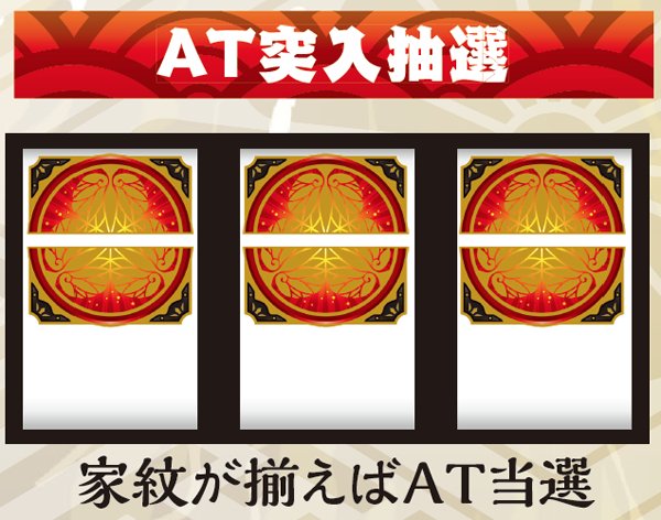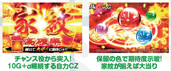 チャンス役から突入する家紋高確は消化中に家紋が揃えばボーナスorATが確定。消化中は家紋の色が重要で、赤や紫でカットインが発生すれば期待大だ。