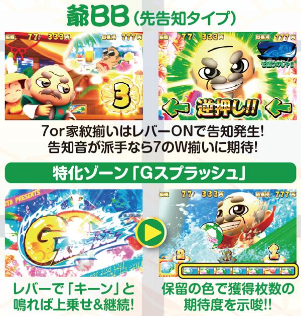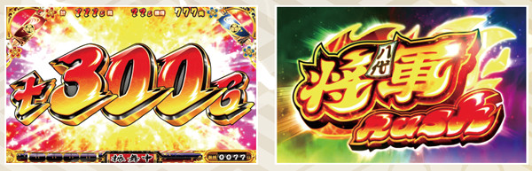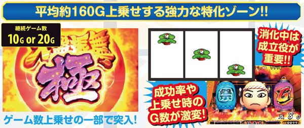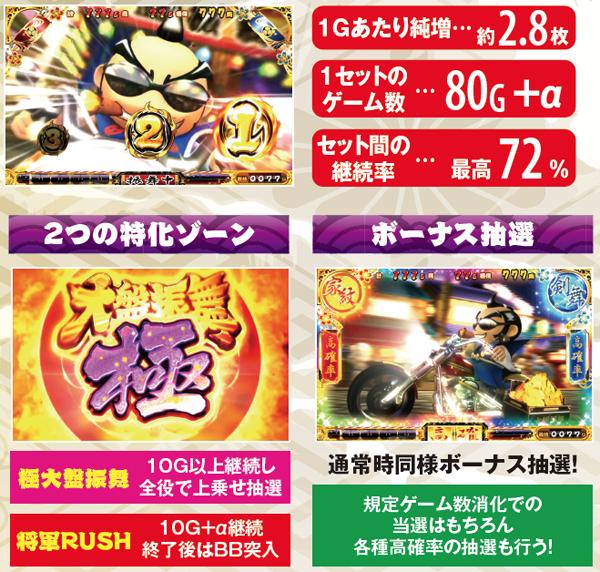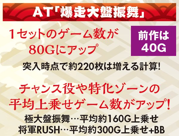 ちなみに前作の特化ゾーン平均上乗せは「極大盤振舞…平均約70G」「将軍RUSH…平均約220G」だった。極大盤振舞の性能は約2.5倍にアップしている。