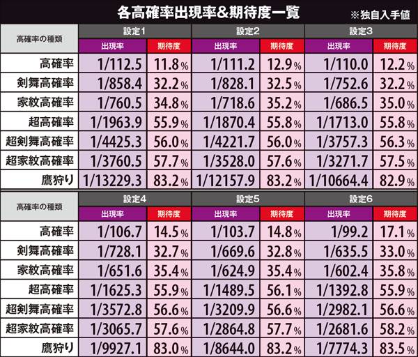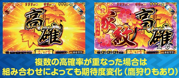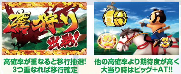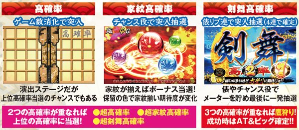 家紋高確率と剣舞高確率は自力チャンスゾーン。通常の高確率はフェイクを含めた前兆示唆の演出ステージだが、3種類ある高確率のうち2つが重なれば上位高確率へ、3つが重なれば鷹狩りへと移行し、鷹狩り成功時はAT+ビッグが確定する。