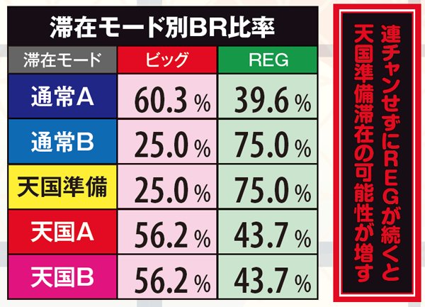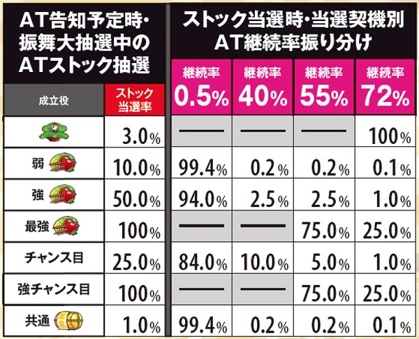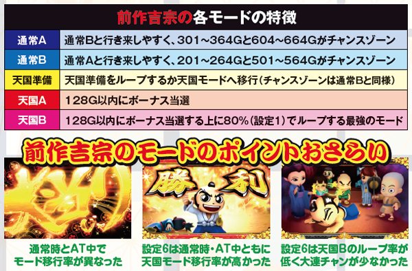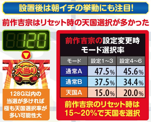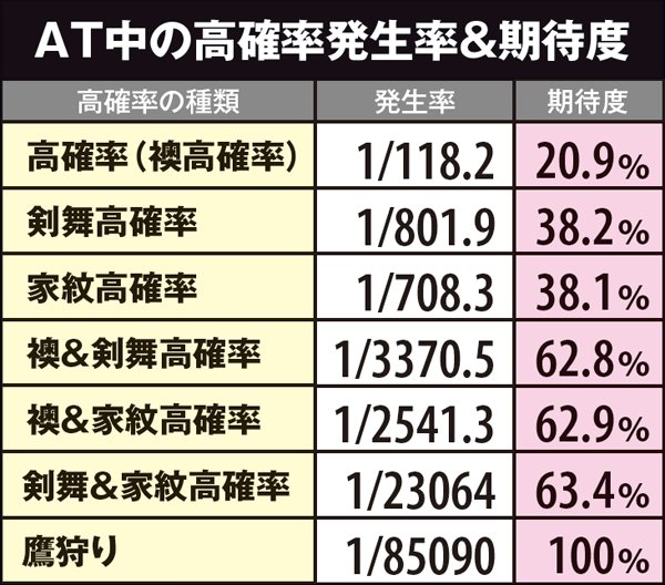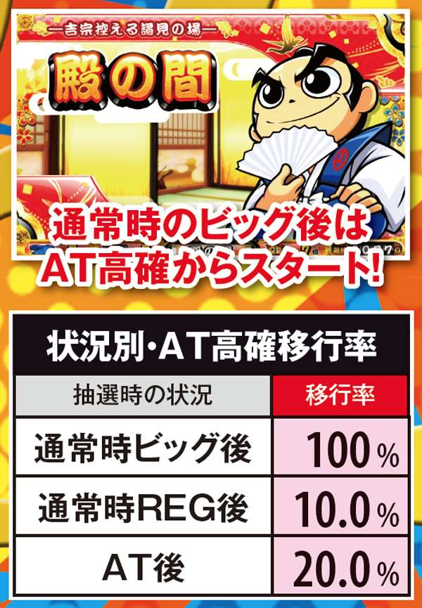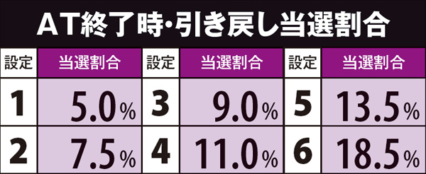 AT引き戻し率は前作吉宗とほぼ同様で、設定1は5%、設定6は18.5%と大きな設定差がある。ATに突入しなければサンプルを得ることはできないが、「AT突入→引き戻し」を繰り返すようなら粘る価値大。共通俵とともに頼りになる推測要素の一つだ。