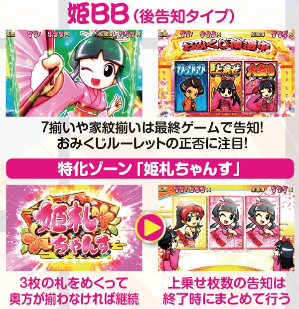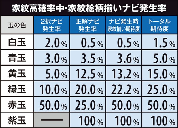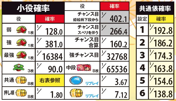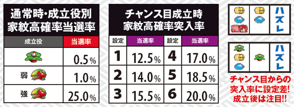 家紋高確率はチャンス役成立から突入し、特に強チェリーとチャンス目が成立した後は突入の大チャンス。チャンス目からの突入率は設定1で12.5%、設定6で20%と設定差も大きいため、突入率を算出して設定推測に活かしたいところだ。