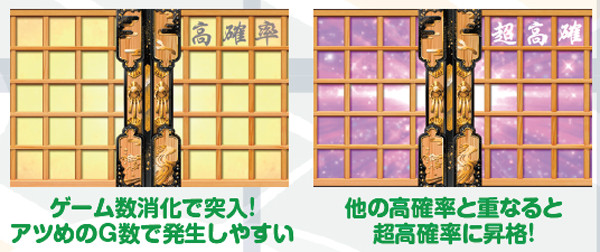 家紋や剣舞が自力でボーナスを引くCZなのに対し、襖高確率は前兆を示唆する演出。ゲーム数当選に期待できるアツいゾーンで突入することが多い。