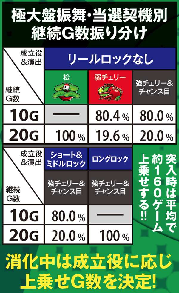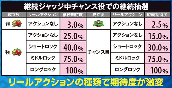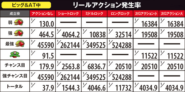※次Gアクションは対象役成立の次ゲームのレバーONで発生し、小ならリール作動が途中で停止、大はリール作動から回転まで発展する