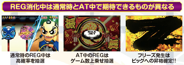 REGは突入時の状態により消化中の抽選内容が変化。通常時なら高確率に、AT中ならゲーム数上乗せに期待が持てる。フリーズが発生したらビッグへの昇格+AT当選確定だ。
