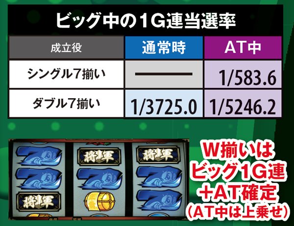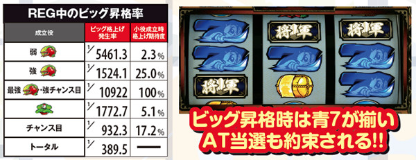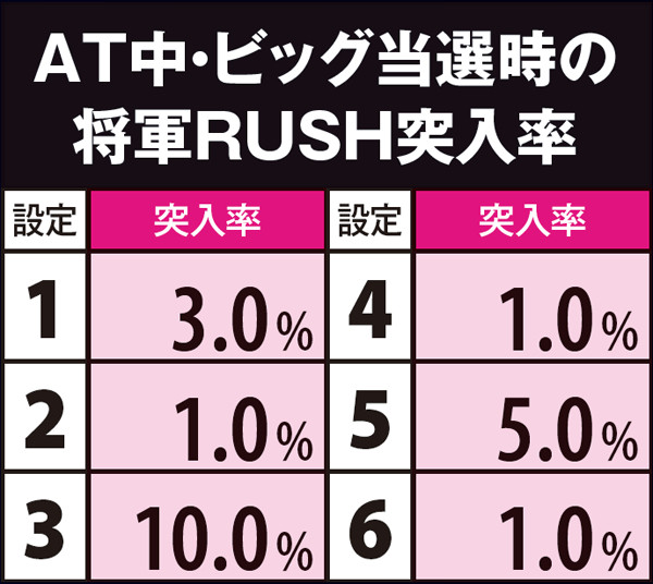AT中のビッグからの将軍RUSH突入率は奇数設定が優遇されている。