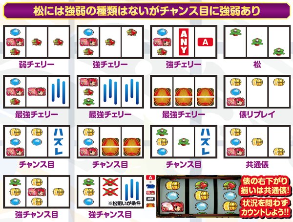 通常時の消化方法はいわゆるチェリー落とし手順で、左リール上~中段にチェリーを目押し。角にチェリーが停止した場合は強弱を見抜くため、中リールをフリー打ちしてから右に家紋絵柄を狙おう。左リールが松までスベッた場合は残りのリールにも松を狙い、松がハズれた場合はチャンス目(or強チャンス目)となる。