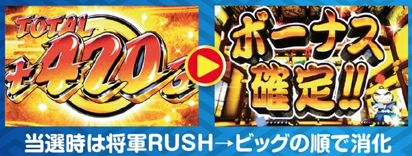 将軍RUSH中は上記の役のほかに家紋絵柄が揃う場合もあり、家紋揃い時は74%で50G、25%で100G、1%で150Gの上乗せを獲得できる。10G消化後も2択に正解し続けている限り続くので夢は無限に膨らむ。