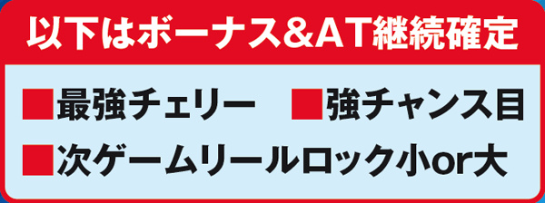 AT終了後は数ゲーム継続する連続演出に突入して継続か否かを告知する仕組みだが、ここでチャンス役を引くと継続抽選に漏れていてもAT継続となる場合がある。