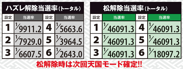 今作でも松解除時は次回天国モードが確定。ハズレ解除は設定差大だが、見極めが難しいのが難点だ。
