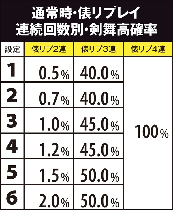 剣舞高確率の基本的な突入契機は通常時の俵リプの連続で、3連すると期待度40~50%と激アツ。